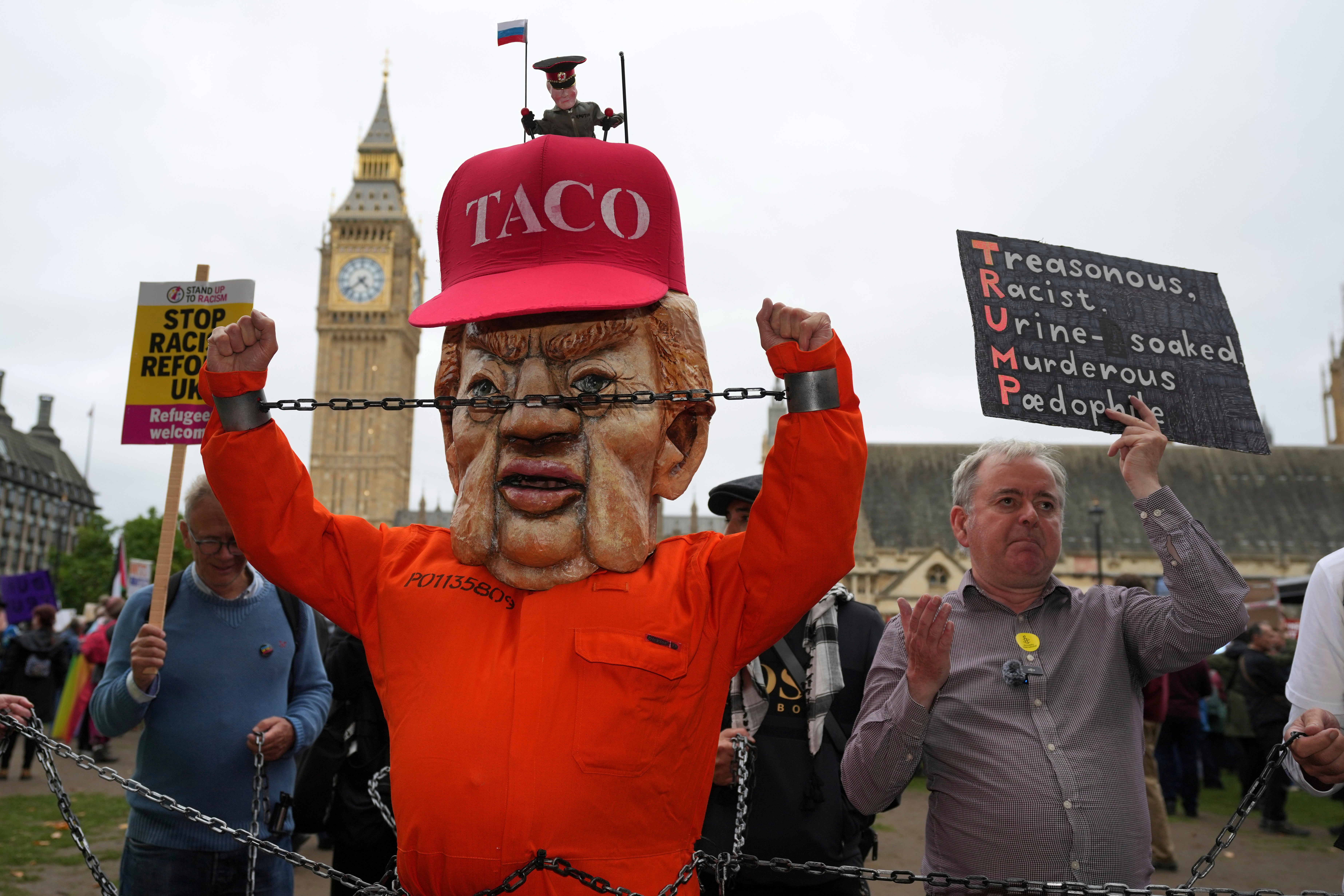 Several Trump impersonators walked the march to Parliament Square, complete with heavily orange tans and voluminous blond hair. Palestinian flags and pro-Palestine placards dominated the gathering, as did chants of “Free Palestine” and “Donald Trump, you’re a clown. You’re not welcome in our town.”