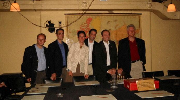 In another, Clinton swims alongside a dark-haired woman who appears to be Epstein’s accomplice, Ghislaine Maxwell.